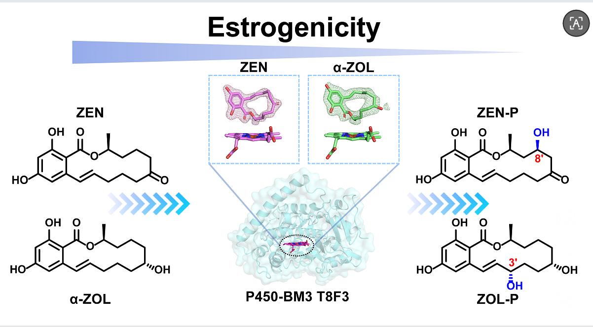 针对这一难题,研究团队从李爱涛实验室的P450酶库中筛选出了一款经过定向进化改造的P450-BM3变体——T8F3。在初始筛查实验中,T8F3可转化54%的ZEN和63.9%的a-ZOL。经T8F3催化生成的羟基化产物,其雌激素活性较母体化合物分别降低了21倍和105倍。闵鉴团队通过检测,证实T8F3介导了区域和立体选择性的羟基化反应。
