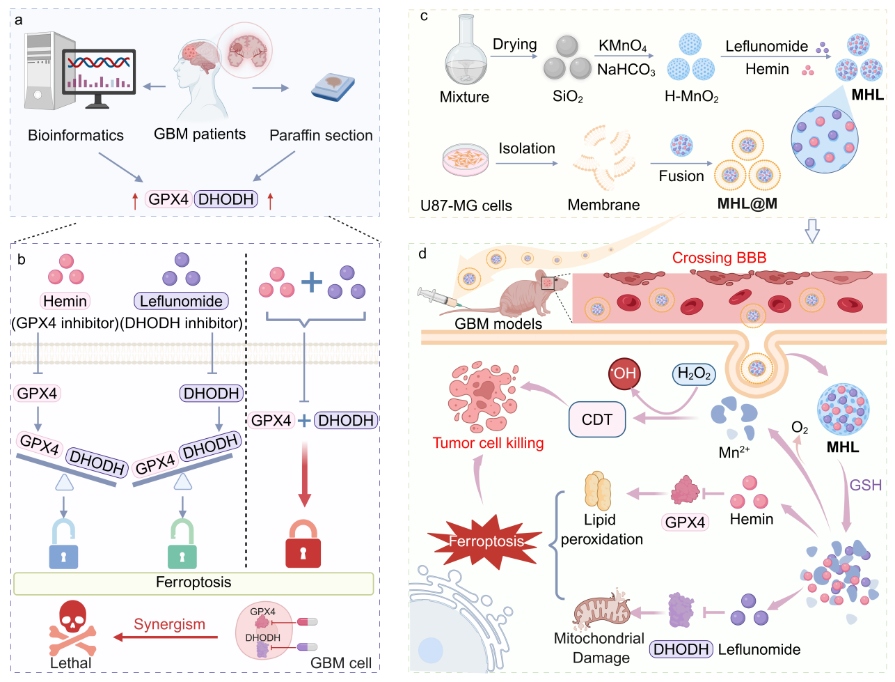更重要的是,新型纳米平台通过下调谷胱甘肽过氧化物酶4和二氢乳清酸脱氢酶进而触发强效铁死亡,在体外和体内实验中均表现出理想的抗肿瘤效果,为胶质母细胞瘤的精准治疗提供了新思路。