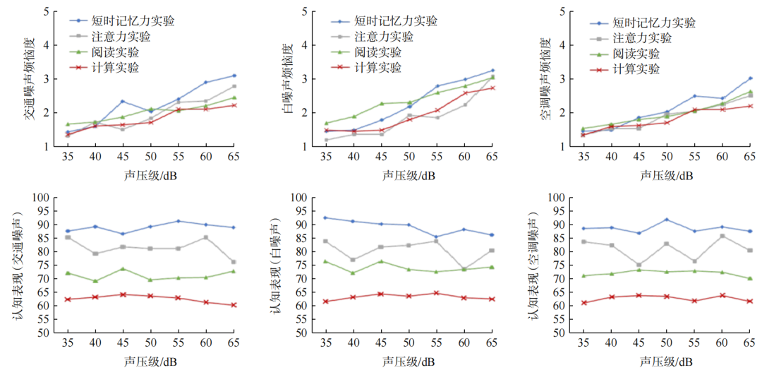 噪声对工作效率和认知成绩的负面影响在许多研究中被证实,且在不同年龄的人群中均有所体现。然而,Thompson等的系统性综述指出,高或中等质量的证据表明噪声暴露分别与老年人或儿童的认知障碍存在关联,暗示或许应当优先关注噪声对老年人或儿童的认知影响。Fuks等的研究表明,社区噪声暴露水平与老年群体的整体认知能力和结构性实践能力受损相关。Weuve等的研究表明,社区噪声水平每增加10 dB(A),65岁以上人群的轻度认知障碍的患病几率增加36%。针对噪声对儿童认知影响的研究也证实了噪声对儿童阅读能力和注意力等认知表现的影响。一项系统的实验室研究揭示了不同的噪声类型对儿童短时记忆、注意力、阅读和计算等不同层级认知任务的影响。声压级越高、认知任务越复杂,在噪声环境下完成相应认知任务引发的烦恼度就越显著增加(图3)。
