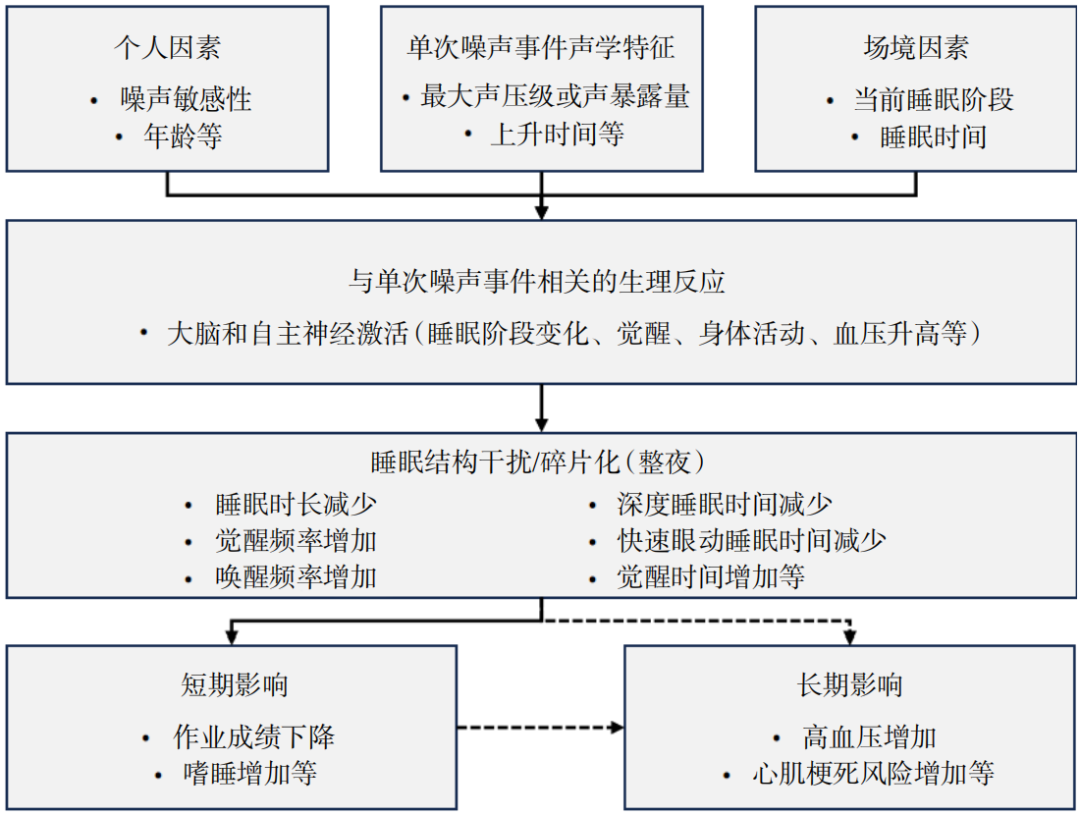 睡眠障碍被认为是环境噪声引起的最严重的非听觉影响,主要表现为入睡延迟与早醒、深度睡眠与快速眼动睡眠减少、清醒时间与浅睡眠阶段增加等。图1显示的是噪声暴露引起睡眠障碍并随之导致健康问题的作用途径,可以看出噪声对睡眠影响的复杂性以及对健康影响的累积性。