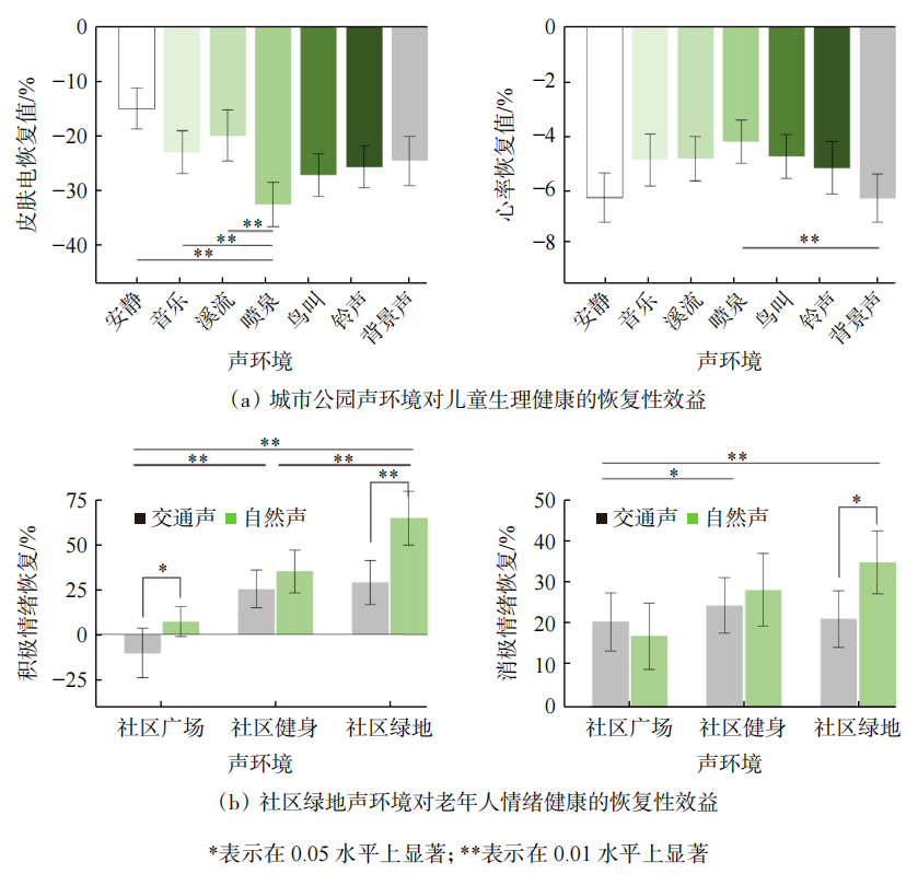 与普通成年人相比,儿童、老人及心理疾病患者在声环境的需求和感知上存在很大差异,因此良好声环境在提升其健康福祉方面的潜力也获得越来越多的关注。研究发现儿童群体在教室中偏好音乐声和嬉闹声,在公园中则更倾向于鸟鸣和流水等自然声。如图7(a)所示,喷泉声在皮肤电恢复方面表现显著,而公园背景声则对心率恢复的效果最佳。如图7(b)所示,针对老年人的实验研究则表明,在社区公共空间中引入自然声可以有效缓解其负面情绪并激发积极情绪。