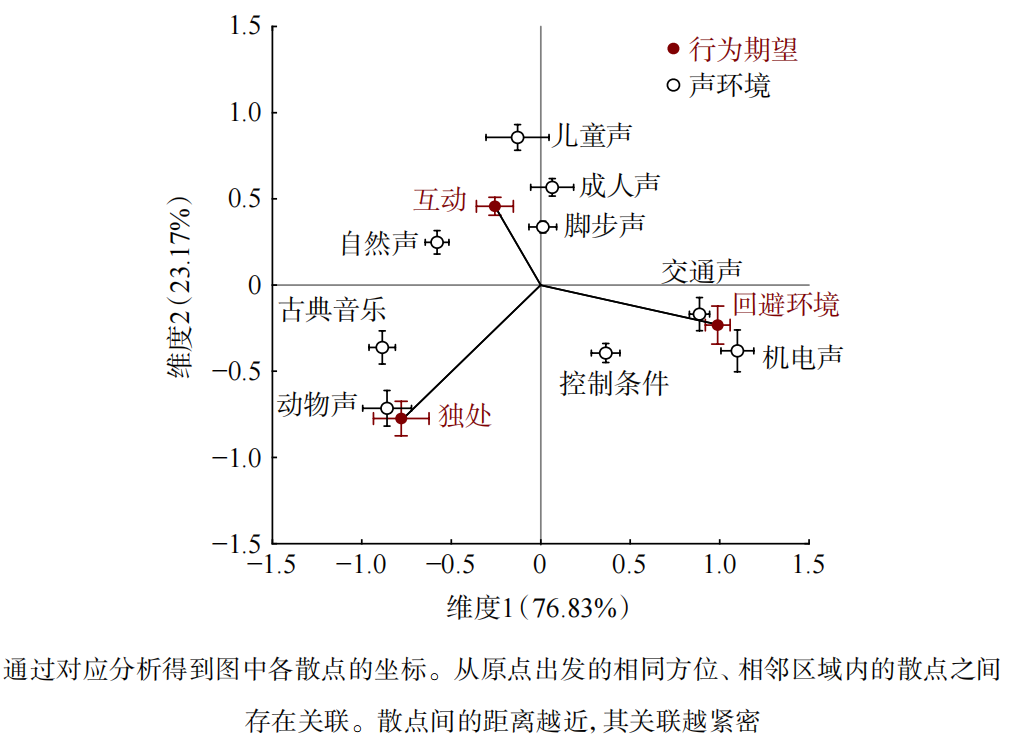 噪声对儿童的行为也会产生负面影响。2023年,一项研究从儿童主体视角考察了短期噪声暴露对其即时行为反应的影响。该研究结果显示:在面对机电噪声和交通噪声时,儿童普遍产生回避环境的倾向;而在儿童声、动物声等声环境中,儿童则表现出更强的社交意愿或独处休憩倾向(图4)。该研究不仅证实了短期噪声暴露对儿童行为存在即时影响,也揭示了积极声环境对儿童健康行为的塑造潜能。