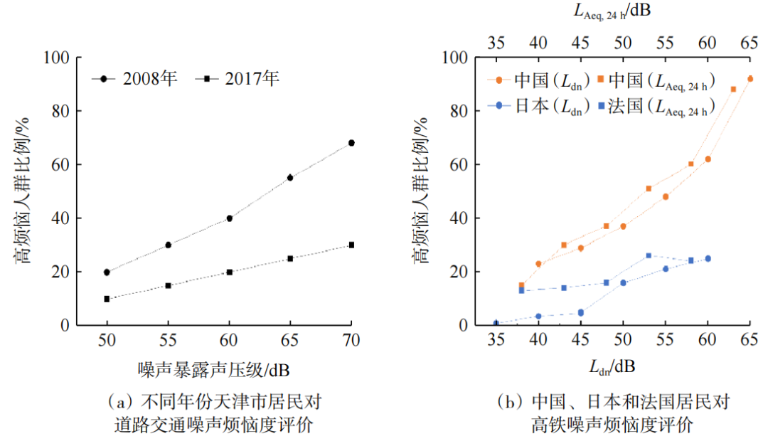 值得注意的是,噪声引起的烦恼度不仅与声源和暴露量等声学因素直接相关,也与人们的人口学特征、敏感性、态度等非声学因素密不可分。Miedema等通过大量的调查数据分析了非声学因素对于噪声烦恼度的作用,发现恐惧和敏感性对噪声烦恼度主观评价的影响最大。通过对中国开展研究的系统梳理,研究人员发现噪声敏感性、对声源的态度、健康状态、对居住环境的满意度和受教育水平都会影响到中国居民噪声烦恼度评价。图2(a)显示的是天津市2008和2017年关于道路噪声烦恼度的评价。图2(b)表明对于同样暴露水平的高速铁路噪声,中国居民表现出比法国和日本居民更高的烦恼度。这些跨年代、跨文化的比较都说明噪声烦恼度在很大程度上被非声学因素所影响,因此噪声政策的制定需要不断更新调查数据作为基础,才能制定出真正保护人们健康的噪声政策与标准。