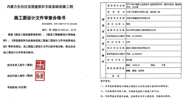 内蒙古鸿鑫新材料有限公司年产6000 吨稀土金属项目取得图审合格证