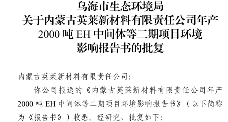 投资6210万元!内蒙古英莱新材料年产2000吨EH中间体等二期项目批复