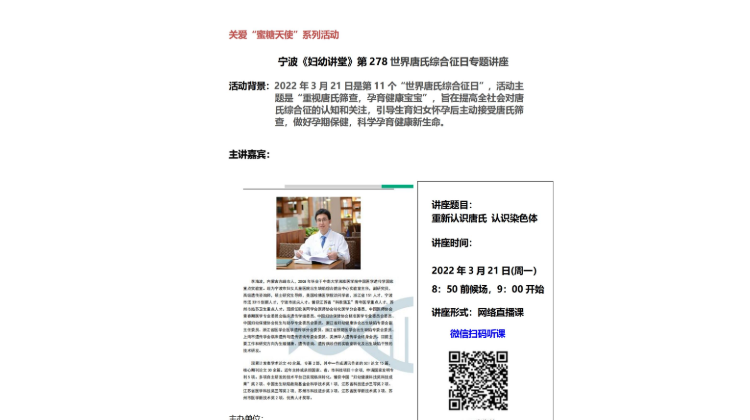关爱“蜜糖天使”系列活动 ---宁波《妇幼讲堂》第278世界唐氏综合征日专题讲座