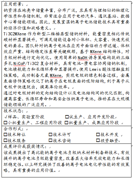 成果简介: 针对钠离子电池界面离子传输动力学迟缓、循环稳定性较差等关键技术瓶颈,从复合钠离子电池负极材料的结构特性出发,对其进行组分、微-纳结构、电极/电解液界面特性调控与优化,构筑三维多孔结构扩充电化学活性位点,缓解电化学过程中电极结构的塌陷,延长循环寿命;耦合高电导率载体与低电位高比能第二相,提高电池能量密度;实现赝电容与电池电化学行为协同储钠,加速氧化还原反应动力学,改善电极大倍率充放电能力。基于以上思路,我们构筑三维多孔NiCoP/Ti3C2复合材料,在1 A g-1的大电流密度下进行2000次循环,稳定提供*** mAh g-1的比容量,长循环稳定性和倍率性能获得显著改善。基于表面修饰策略构筑NiCu双金属团簇修饰Ti3C2纳米片,在100 mA g-1电流密度下展现*** mAh g-1的放电比容量,100次循环后容量保持率为***%,库伦效率显著提升。 以上研究成果证明我们提出的高能量密度钠离子电池负极制备技术切实可行,可提升电池能量密度和循环寿命,有效改善钠离子电池电化学性能。