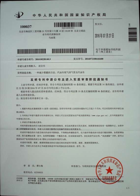 一种减少雾霾的汽油车尾气排气管及汽油车
