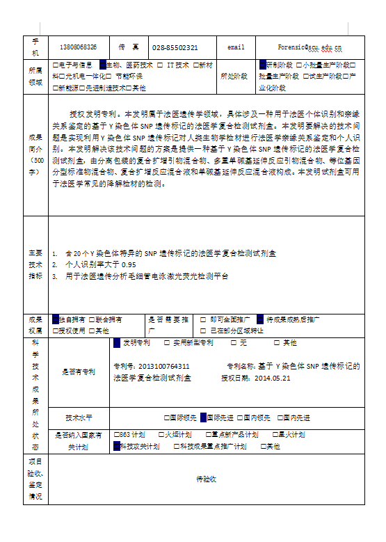 基于Y染色体SNP遗传标记的法医学复合检测试剂盒