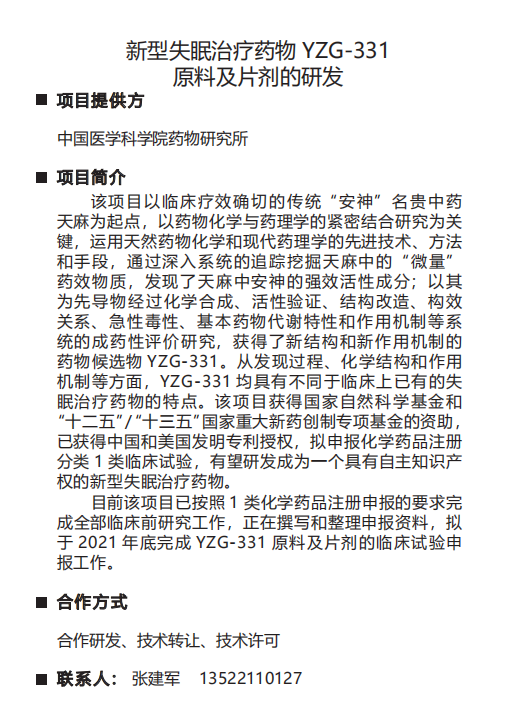 新型失眠治疗药物 YZG-331 原料及片剂的研发