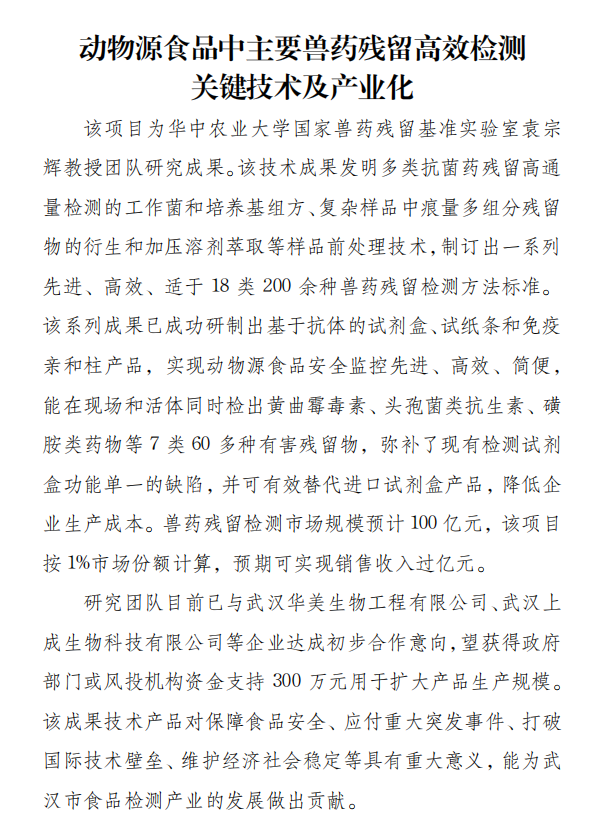 动物源食品中主要兽药残留高效检测关键技术及产业化