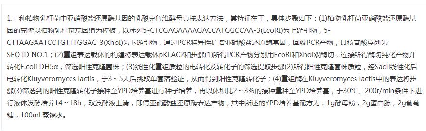一种植物乳杆菌中亚硝酸盐还原酶基因的乳酸克鲁维酵母真核表达方法