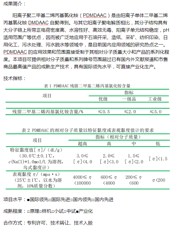 阳离子聚二甲基二烯丙基氯化铵 PDMDAAC 系列产品及生产技术