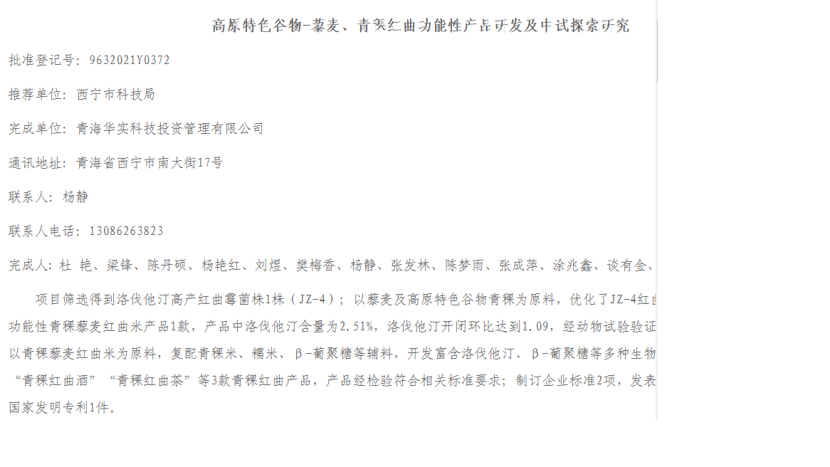 高原特色谷物-藜麦、青稞红曲功能性产品研发及中试探索研究