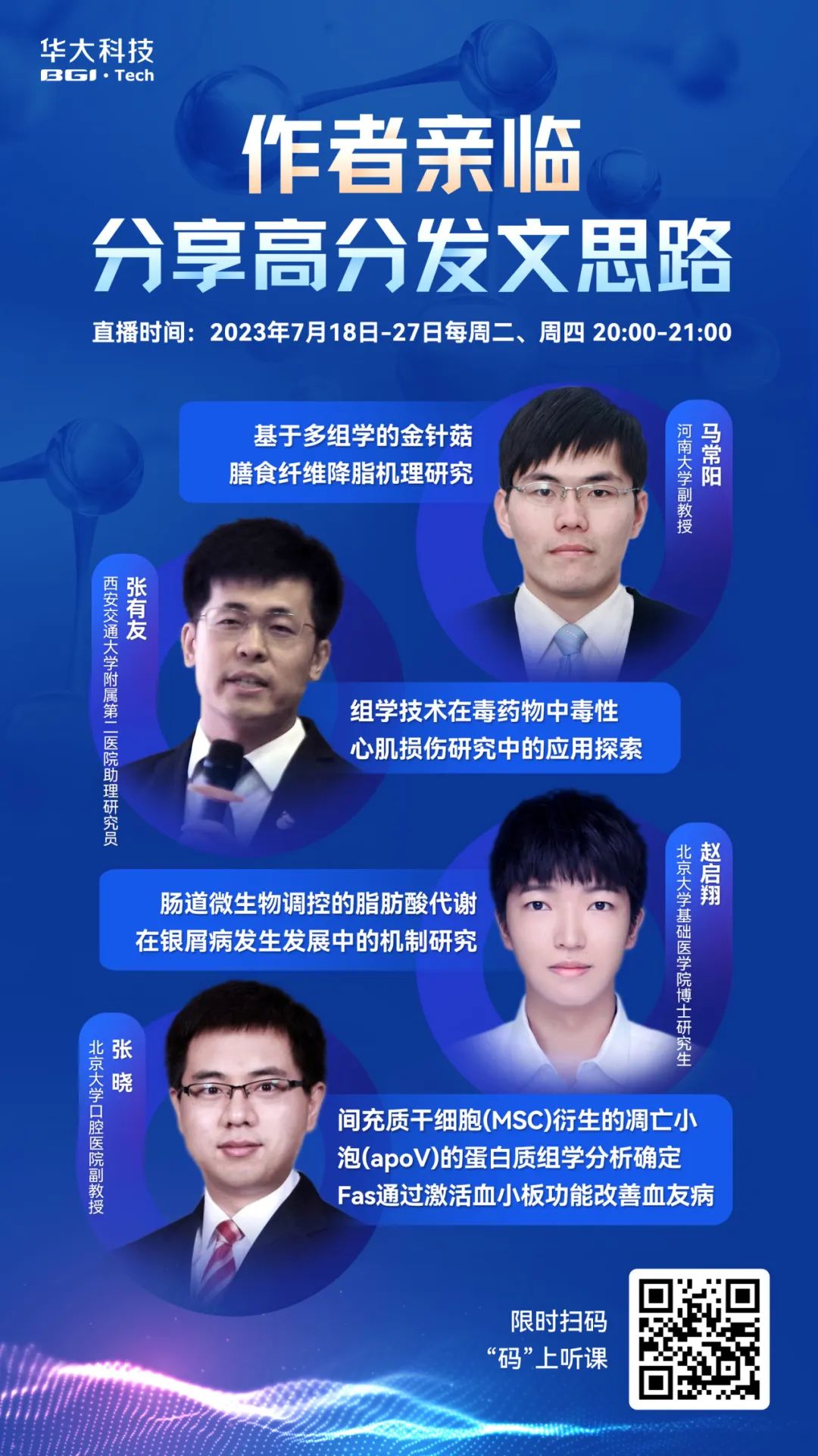2023年7月18日-27日,华大科技将举办“作者亲临分享高分发文思路”线上研讨会,诚挚地邀请到了河南大学马常阳副教授、西安交通大学附属第二医院张有友助理研究员、北京大学基础医学院赵启翔博士、北京大学口腔医院张晓副教授,为大家分享蛋白质组或代谢组等多组学高质量文章的思路和经验。同时,您还将有机会与四位专家进行交流和互动,深入了解他们的研究方法和心得体会。