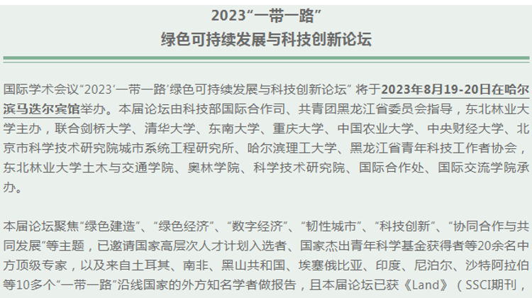国际学术会议“2023‘一带一路’绿色可持续发展与科技创新论坛” 将于2023年8月19-20日在哈尔滨马迭尔宾馆举办。本届论坛由科技部国际合作司、共青团黑龙江省委员会指导,东北林业大学主办,联合剑桥大学、清华大学、东南大学、重庆大学、中国农业大学、中央财经大学、北京市科学技术研究院城市系统工程研究所、哈尔滨理工大学、黑龙江省青年科技工作者协会,东北林业大学土木与交通学院、奥林学院、科学技术研究院、国际合作处、国际交流学院承办。