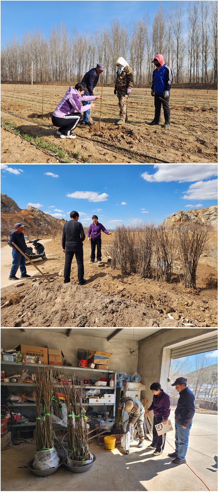前期工作中,特派团已为双塔区嘎岔村、骆驼山子村和洞子沟村免费提供了早金酥梨、乐淇苹果、岳阳红苹果和鸡心果苹果4个新品种共988株苗木,并通过线上指导项目负责人完成苗木根系修剪和浸泡处理。专家抵达果园后,现场示范果树栽植方法,并重点强调栽植不能过深、嫁接口略高于地面、栽植后灌透水及覆盖地膜等关键技术,以保证苗木的成活率。其间,特派团一行来到下洼村,对冷棚辽峰葡萄出土上架进行了指导。